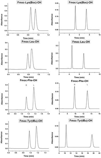 Selected chromatograms of Nα-Fmoc-protected proteinogenic amino acids. Chromatographic conditions: columns, ZWIX(+)™ and QN-AX™; mobile phase, CO2/MeOH (60/40 v/v) containing 30 mM TEA and 60 mM FA; flow rate, 2.0 mL min−1; Tcol, 40 °C; back pressure, 150 bar; detection, 262 nm.