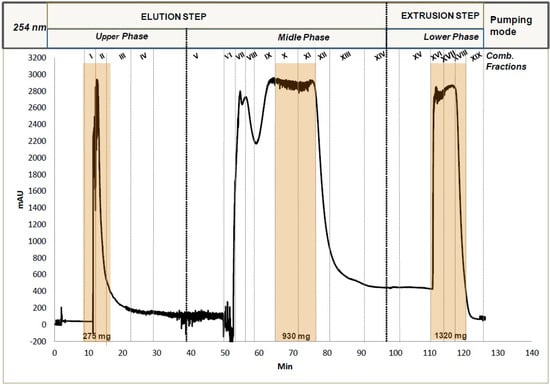 Step-gradient CPC chromatogram of 3 g crude methanol extract of P. abies bark at 254 nm; Stationary phase: lower phase of the triphasic system; Mobile phase; upper and middle phases for the elution step and lower phase for the extrusion step, all in ascending mode.
