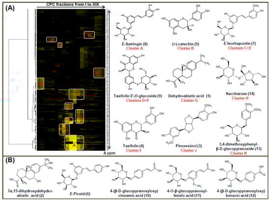 The major compounds contained in the CPC fractions were firstly identified by using a recently developed 13C-NMR-based dereplication procedure. All CPC fractions (from I to XIX) were analyzed by 13C-NMR spectroscopy. Automatic peak picking and alignment of 13C-NMR signals across spectra of the fraction series resulted in a table with 19 columns (one per fraction) and 571 raws (one per chemical shift bin containing at least one signal in at least one fraction). By applying hierarchical clustering analysis on the lines of this dataset, statistical correlations between 13C-NMR resonances belonging to individual molecular structures within the fractions were readily visualized as well-defined chemical shift clusters colored in yellow in front of the corresponding dendrograms. Figure 2 shows the HCA correlation heat map. After entering the values of each chemical shift belonging to the same cluster into the local database containing 13C-NMR data of natural compounds including known metabolites from Picea abies, nine compounds were directly identified, including one diterpene, dehydroabietic acid (1), three flavonoids, (+)-catechin (5), taxifolin (4) and taxifolin-3′-O-glucoside (9), two stilbene glycosides, E-astringin (8) and E-isorhapontin (7), one lignan, pinoresinol (3), one phenolic derivative, 3,4-dimethoxyphenyl-β-d-glucopyranoside (13), and saccharose (14) (Figure 2A). The chemical structures of identified compounds were confirmed by HRMS analysis. Dehydroabietic acid is a common abietane diterpene encountered in Pinus resins. It was previously reported in the needles, resin and barks of P. abies []. Pinoresinol, (+)-catechin, taxifolin, taxifolin-3′-O-glucoside, E-astringin and E-isorhapontin are present in several tree species, including P. abies. Particularly, stilbene derivatives have been reported as the main secondary metabolites of the polar bark extract of common spruce []. 3,4-Dimethoxyphenyl-β-d-gluco- pyranoside has been previously reported in root bark of P. abies [].