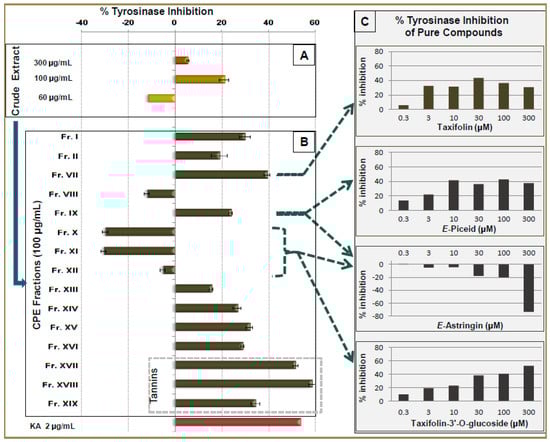 Tyrosinase inhibition activity of methanol bark extract, CPC fractions and pure compounds. (A) % inhibition activity of crude extract at 300, 100 and 60 μg/mL , (B) % inhibition activity of CPC fractions at 100 μg/mL and (C) % inhibition activity of pure taxifolin, E-piceid, E-astringin and taxifolin-3′-O-glucoside in six concentrations (0.3, 3,10, 30, 100 and 300 μM). Positive control: Kojic Acid (KA) at 2.0 μg/mL.