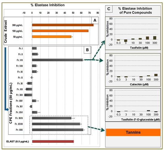 Elastase inhibitory activity of methanol bark extract, CPC fractions and pure compounds. (A) % inhibition activity of crude extract at 300, 100 and 50 μg/mL, (B) % inhibition activity of CPC fractions at 50 μg/mL and (C) % inhibition activity of pure taxifolin, catechin and taxifolin-3′-O-glucoside in six concentrations (0.3, 3,10, 30, 100 and 300 μM). Positive control: Elastatinal (ELAST) at 0.5 μg/mL.