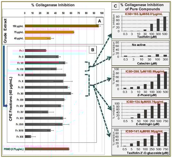Collagenase inhibitory activity of methanol bark extract, CPC fractions and pure compounds. (A) % inhibition activity of crude extract at 150, 75 and 40 μg/mL, (B) % inhibition activity of CPC fractions at 40 μg/mL and (C) % inhibition activity and IC50 value of pure taxifolin, catechin, E-piceid, E-astringin and taxifolin-3′-O-glucoside . Positive control: Phosphoramidon (PRMD) at 3.75 μg/mL.