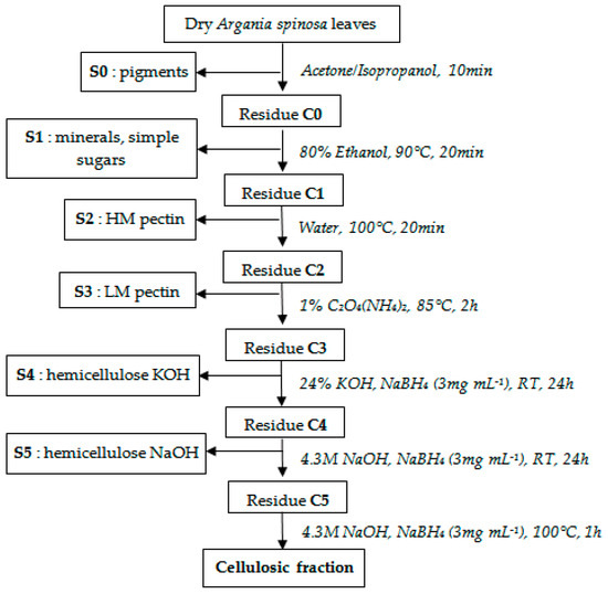 Dry Argania spinosa leaves (10 g) were treated sequentially with acetone/isopropanol (v/v) and 80% EtOH (20 min at 90 °C) to remove hydrocarbons, lipids, flavonoids, and oligomers. The alcohol insoluble residue (5.1 g) was depectinated by treatment with hot water (20 min at 100 °C), and 1% ammonium oxalate solution (2 h at 85 °C). The residue was then twice extracted, sequentially with 500 mL of 24% KOH and 4.3 M NaOH solutions containing NaBH4 (3 mg·mL−1) for 24 h. The different alkali extracts were neutralized by addition of glacial acetic acid and dialyzed against water (MWCO 6–8000 Da, Spectrapor, Rancho Dominguez, CA, USA). Hemicelluloses were finally precipitated by addition of three volumes of ethanol to the aqueous solution; the pellet was recovered after centrifugation, solubilized in water, and then freeze-dried and stored (Figure 3).