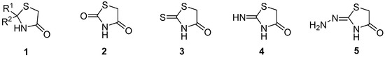 1,3-Thiazolidin-4-ones are very versatile compounds both as synthetic intermediates and potential drugs [12,13,14,15,16,17,18,19]. Substituents in the 2-, 3-, and 5-positions of the basic skeleton may be modified. According to substitution in the 2-position, 1,3-thiazolidin-4-one derivatives can be subdivided into several classes: alkyl or (hetero)aryl substituted thiazolidin-4-ones 1, thiazolidine-2,4-diones 2, rhodanines 3, 2-iminothiazolidin-4-ones (pseudohydantoins) 4, and 2-hydrazonothiazolidin-4-ones 5 (Figure 1). All of them can be further substituted on N-3 and/or methylene group in position 5 of the 1,3-thiazolidin-4-one skeleton and compounds 4 and 5 also on imino or amino group of the substituent [12].
