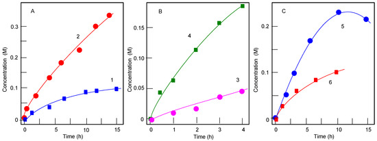 The 1-phenylethanol (0.33 M) oxidation with tert-butyl hydroperoxide (TBHP; 70%, aqueous, 1.65 M): (A) Accumulation of acetophenone with time in in the absence (curve 1) and in the presence (curve 2) of compound 1 (5 × 10−4 M). The reaction gave TON 650 and TOF 50 h‒1. Temperature was 70 °C, solvent was acetonitrile (total volume of the reaction solution was 5 mL); (B) The same oxidation catalyzed by complex 4 at 50 (curve 3) and 70 °C (curve 4); (C) The same oxidation ([TBHP]0 = 0.9 M) catalyzed by complexes 9 (curve 5) and 10 (curve 6) at 70 °C.
