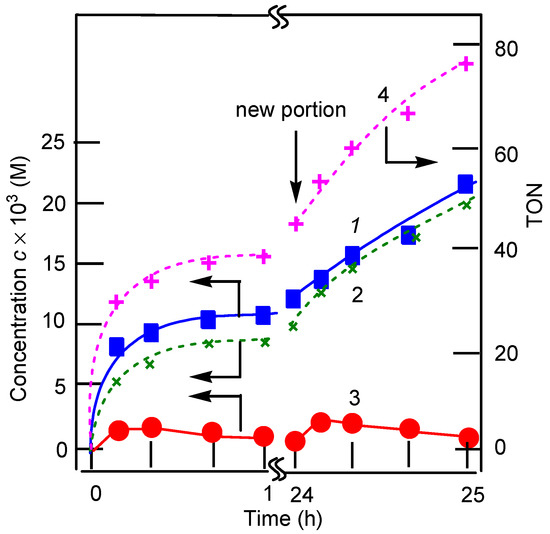 Accumulation of cyclohexanol (curve 1), cyclohexanone (curve 2), and cyclohexyl hydroperoxide (curve 3), as well as TON (curve 4) in the reaction of cyclohexane (0.46 M) with MCPBA (0.025 M) in MeCN at 25 °C catalyzed by Mn(ClO4)2 (5 × 10−4 M). Concentrations of cyclohexanone and cyclohexanol were measured by GC twice: before and after the reduction of the reaction mixture with PPh3 [46,47,48,49,50,51,52,53,54,55,56]. At the time moment denoted by an arrow, an additional amount (0.025 M) of MCPBA was introduced into the reaction solution. After 25 h, TON was 76, and the yield of all oxygenates based on MCPBA was 76%.