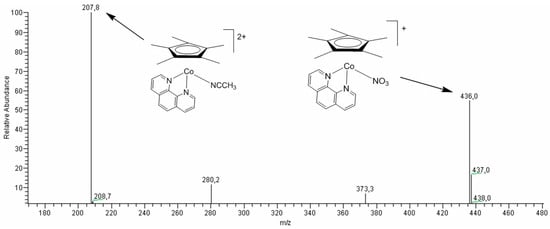 In order to determine possible organo-cobalt spices responsible for the catalytic oxidation of alkanes by MCPBA, we investigated the reaction of the obtained cobalt complexes with HNO3 by the ESI-MS method, which is a common tool to gain mechanistic insights into homogeneous metal-catalyzed reactions [92]. The primary reaction of containing bidentate nitrogen ligands iodide complexes 7, 9, and 10 with HNO3 in acetonitrile leads to the replacement of iodide with either a nitrate anion or an acetonitrile molecule. Thus, the ESI-MS spectrum of the reaction mixture with complex 7 (Figure 6) reveals two main peaks corresponding to ionic fragments [Cp*Co(phen)(CH3CN)]2+ (m/z = 207.8) and [Cp*Co(phen)(NO3)]+ (m/z = 436.0). It can be concluded on the basis of Table 3 (runs 33, 36–39) that complexes 7, 9, and 10 containing phenanthroline or dipyridine ligands are the poorest catalysts in the alkane oxygenation.