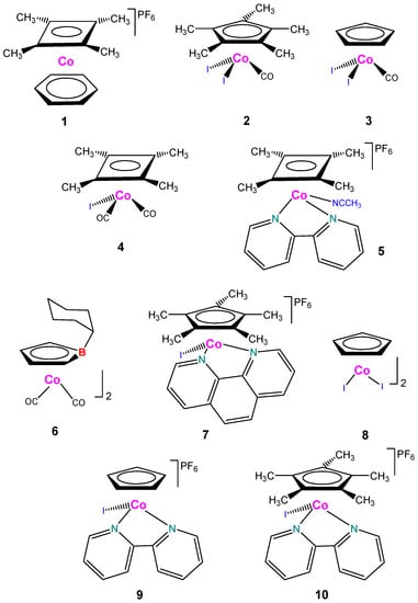 The main geometric parameters of 10 resembles those in a recently characterized chloride analog [Cp*Co(bipy)Cl]PF6 [45]. For example, the dihedral angle between the Cp and bipy planes in 10 (38.2°) is close to that in [Cp*Co(bipy)Cl]PF6 (41.5°) but smaller than in 9 (average 50.1°) and 7 (49.2°).