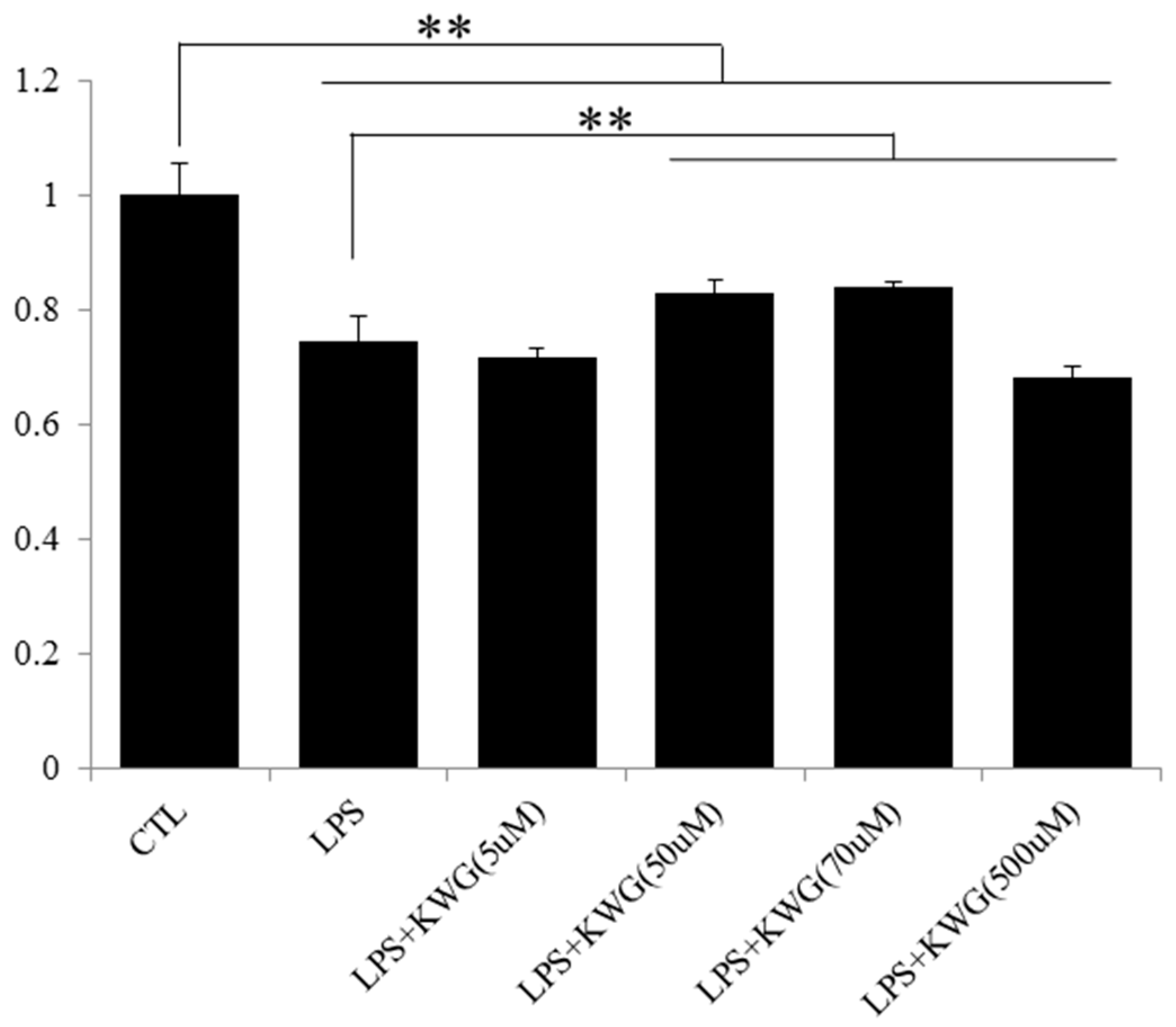 KWG dose-dependently reversed tumor necrosis factor (LPS)-damaged viability of Caco-2 cells. Cells were cultured in 96-well plates and were treated with 100 μg/mL LPS for 30 min followed by different concentrations of KWG for 24 h. The cell viability was detected by an 3-(4,5-Dimethylthiazol-2-yl)-2,5-diphenyltetrazolium bromide (MTT) method. The experiment was repeated six times. ** p < 0.01.