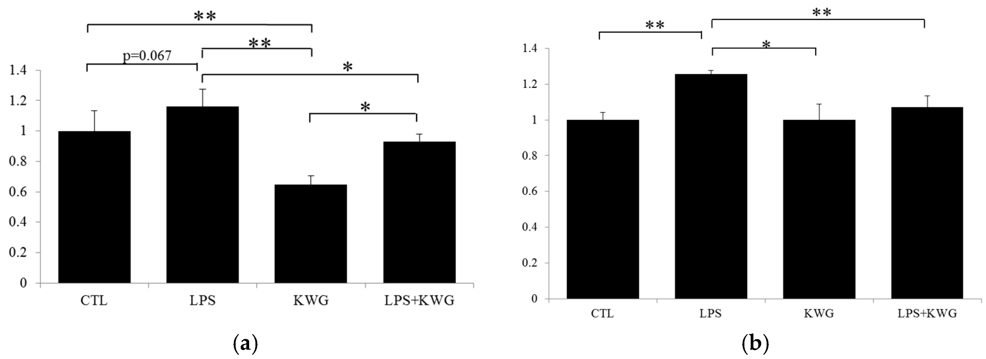 Pro-inflammatory cytokines such as TNF-α and interleukin (IL)-1β will enhance the inflammatory response by promoting the recruitment and activation of other inflammatory elements, thus increasing the production and release of inflammatory mediators [27]. In the present study, we found 100 μg/mL LPS incubation dramatically increased the secretion of inflammatory cytokines compared with control (IL-1β, p = 0.067; TNF-α, p < 0.01) (Figure 3). In addition, KWG treatment could significantly reverse effects of LPS on the secretion of IL-1β and TNF-α to the normal levels.