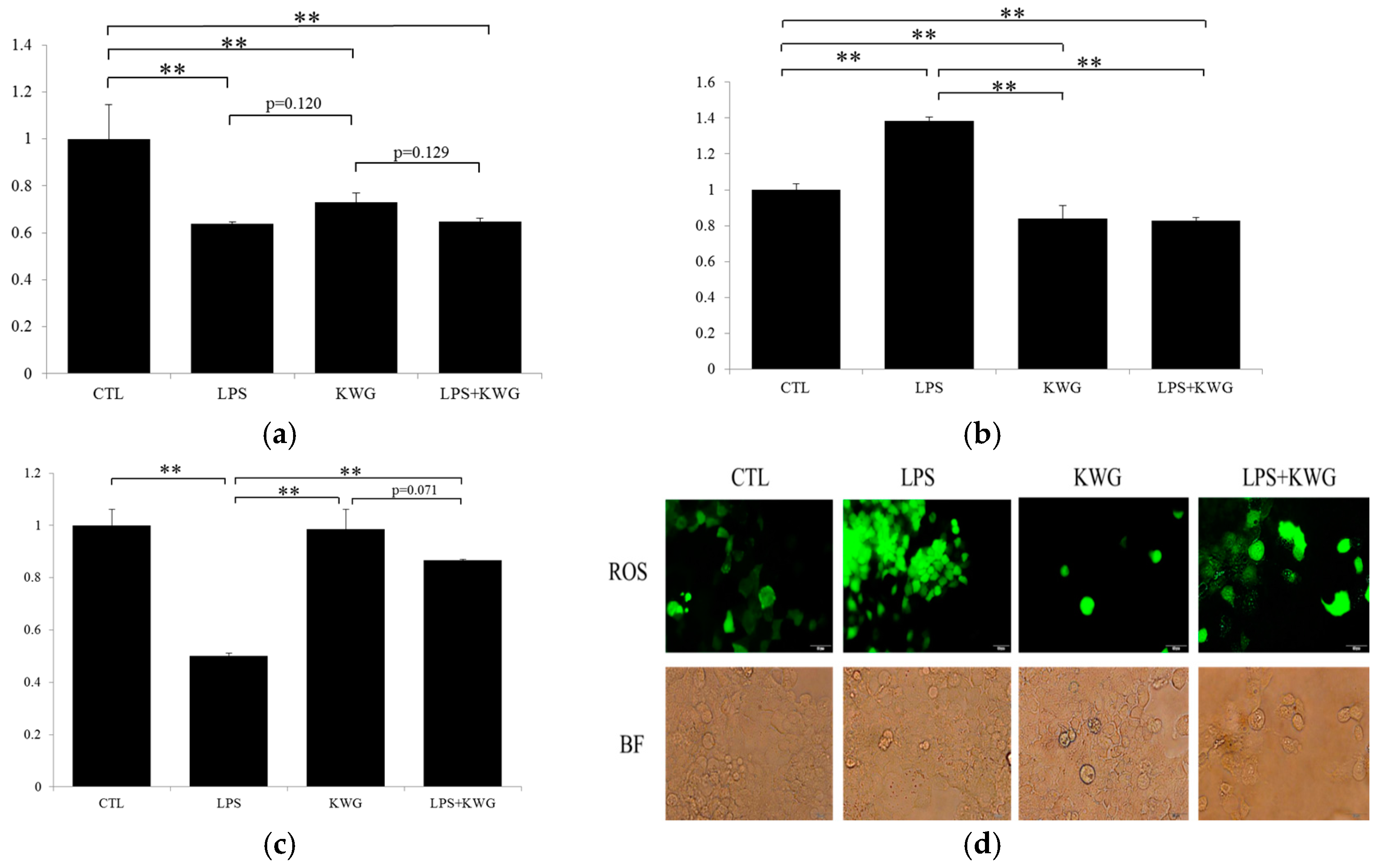 2.3. KWG Increased Anti-Oxidative Stress Ability of Caco-2 Cells Induced by LPS