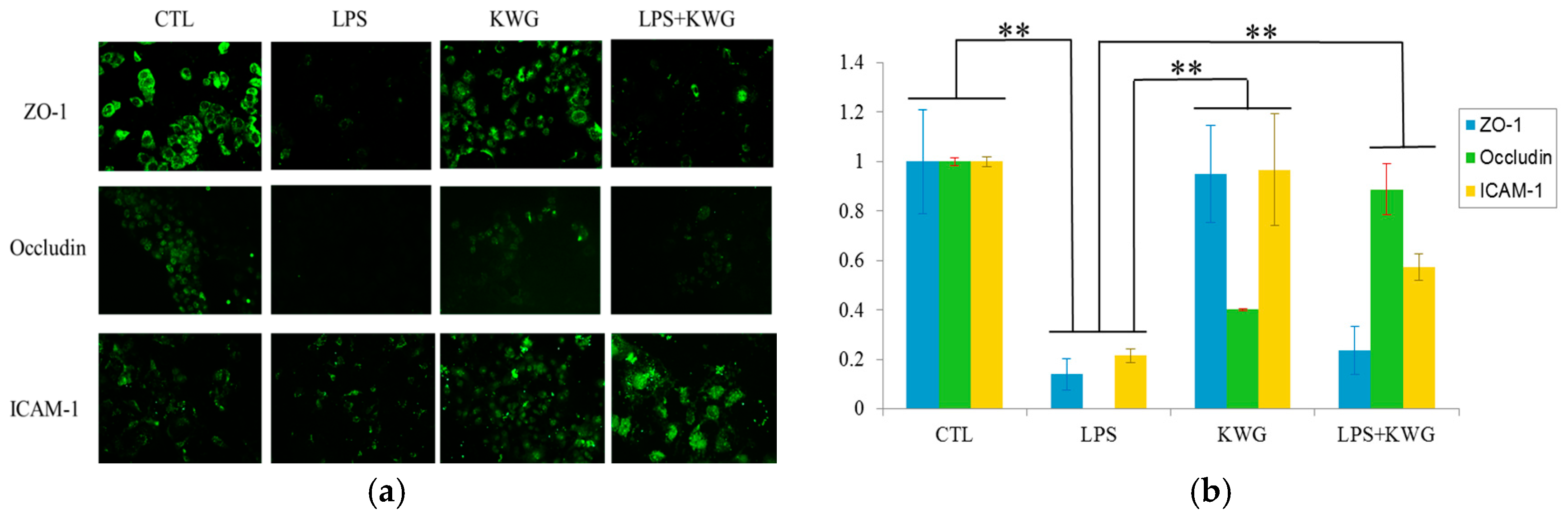KWG upregulated the intercellular tight junction proteins’ expression. (a) Caco-2 cells were treated with control (CTL), LPS, KWG or LPS + KWG for 24 h, intercellular junction proteins including zonula occludens (ZO)-1, Occludin and intercellular adhesion molecule (ICAM)-1 were detected by the immunofluorescence method (magnification: 200). (b) Relative protein expressions were analyzed by Image-pro Plus software. The experiments were repeated three times and representative pictures were shown. ** p < 0.01.