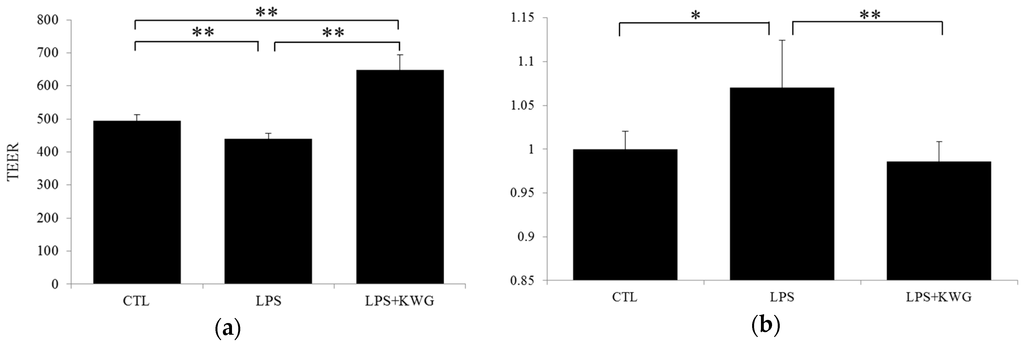 2.5. KWG Strengthened Gut Epithelial Barrier Integrity in LPS Circumstances