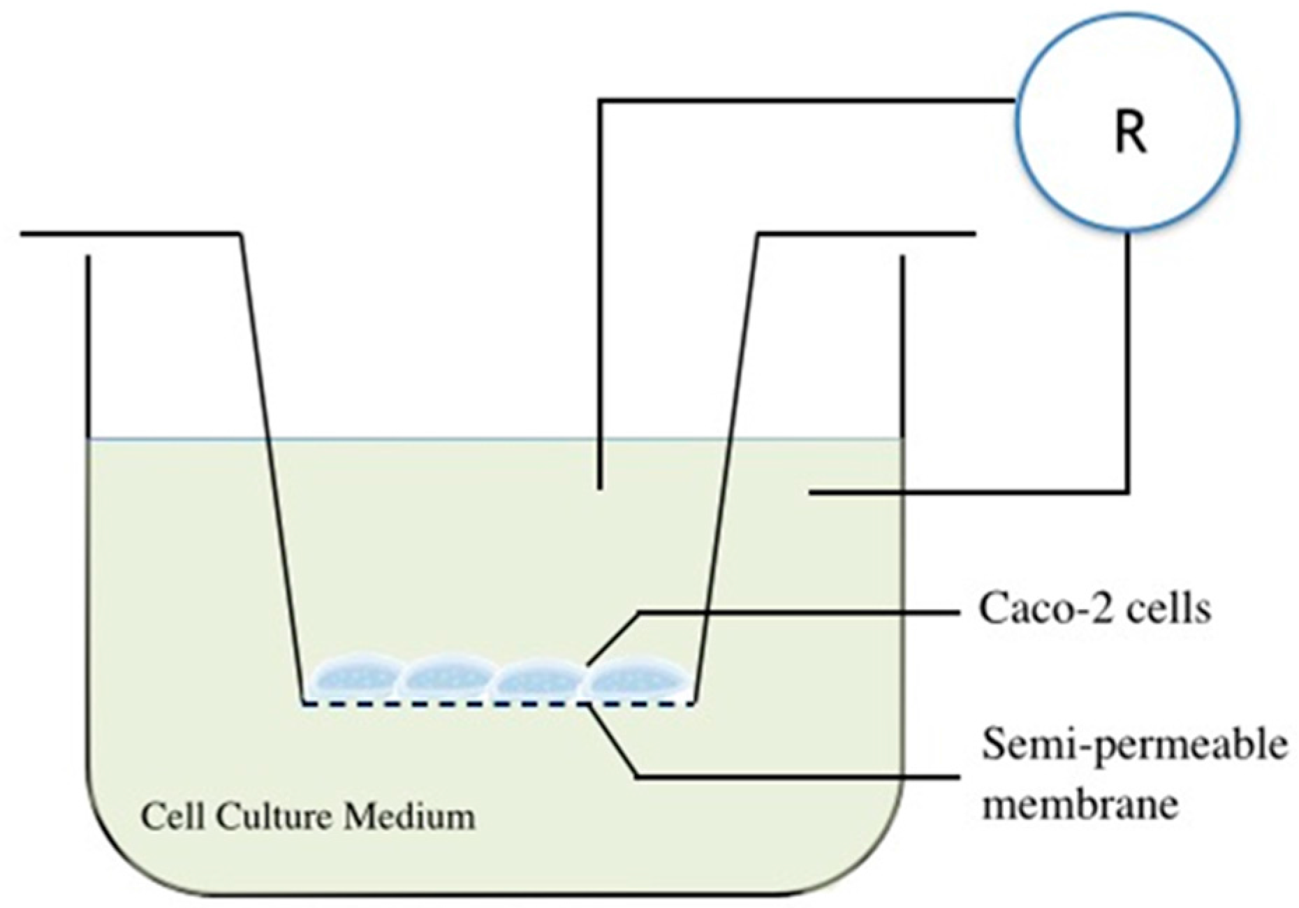 An in vitro gut epithelial barrier model was constructed using cell culture inserts according to the method described previously [59]. In brief, Caco-2 cells were cultured in the medium and seeded at a density of 1 × 105 cells into inserts with a polyethylene terephthalate membrane (pore diameter, 0.33 μm) plated in 24-well cell culture plates (Figure 7). Then, the cells were maintained in the cell incubator for 21 days for cell culturing, and a confluent monolayer was finally obtained. The TEER across the monolayers was measured with a Millicell-ERS electric resistance system (Millipore, Billerica, MA, USA) [60], and the mean TEER will exceed 400 Ω · cm2 after 21 days of incubation [61].