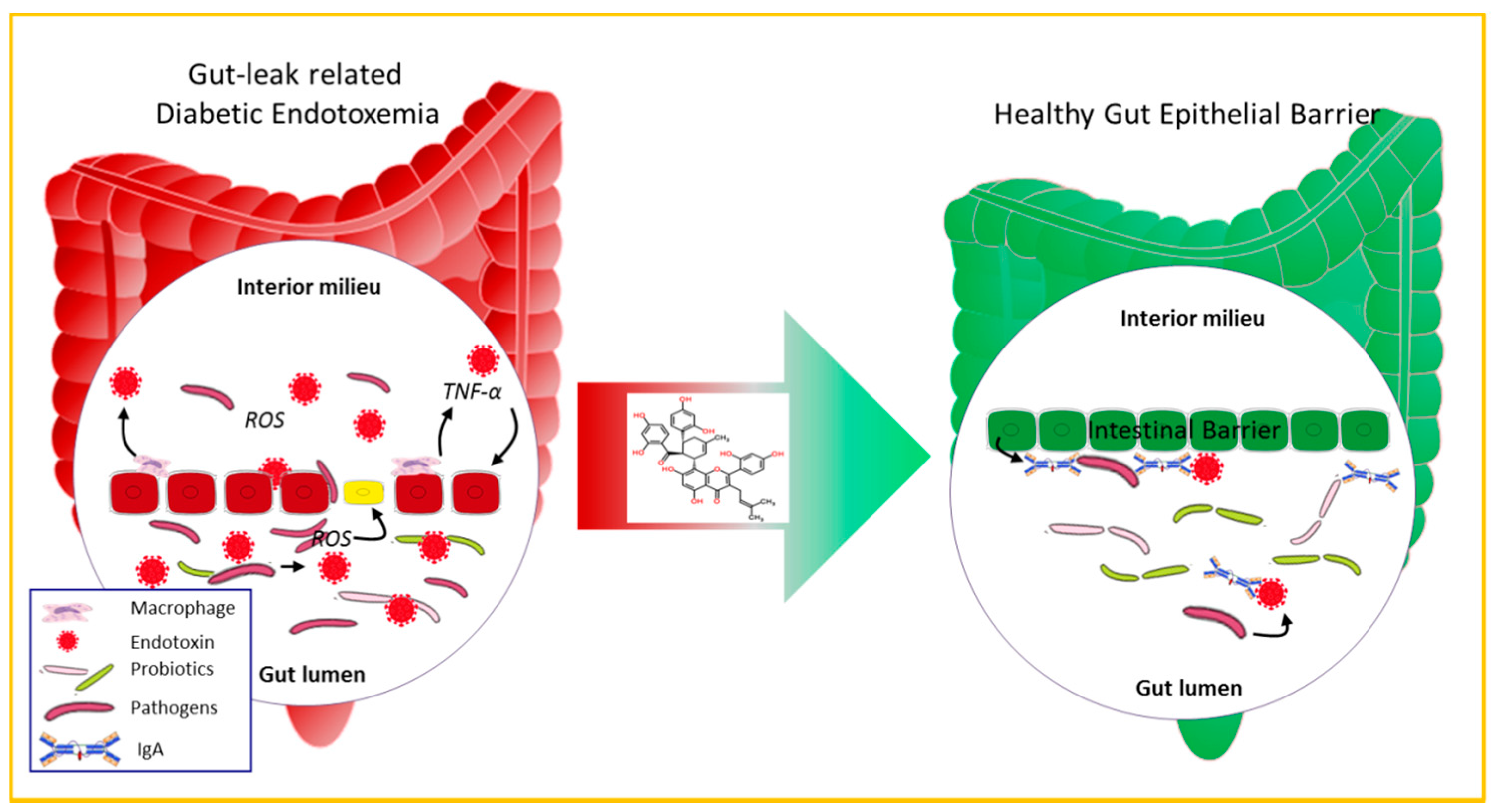 The gastrointestinal tract constitutes an important part of the innate human immune system and is recognized to play a pivotal role in immediate protective response against pathogen invasion within the gut lumen [3,4]. The gut innate immune system is mainly composed of the epithelial cell barrier and the immune cells (e.g., neutrophils and natural killer cells). It is proposed that the defects of the cell barrier will lead to a paracellular influx of luminal antigens and toxins [5] and result in gut-sourced systemic inflammation. Although the adaptive immune system may counteract the pathogen and entoxin’s aggression to some extent under these settings, the overall effect is largely discounted. On the other hand, with the recognition of microbiota, it is suggested that gut dysbacteriosis should be the source of diabetic-endotoxemia [1]. Studies in both animal models and the human population have confirmed that gut dysbacteriosis will happen [6,7] and endotoxin-producing bacteria will increase [6] under DM settings. Studies found that endotoxin, with lipopolysaccharides (LPS) as representatives that originate from the cell wall of Gram-negative bacteria, is correlated with the severity of systemic inflammation [8,9]. As is well-known, LPS is responsible for multiple negative activities in the organism, including breaking down the integrity of different kinds of biological barriers. Therefore, strengthening the integrity of the gut epithelial barrier and inhibiting lumen LPS production or functions will help to ameliorate diabetic-endotoxemia.