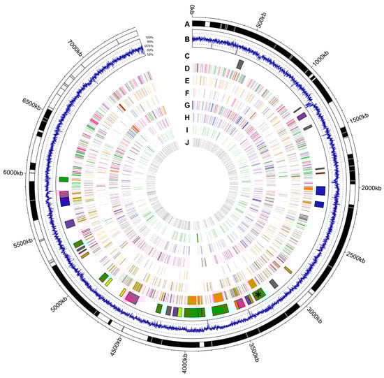 The genome was visualized by Circos, generated with the R package circlize [,]. Therefore, the scaffolds with gaps were visualized, the GC content in 500 bp ranges (each 250 bp), the predicted secondary metabolite gene clusters and annotated ORFs grouped by function.