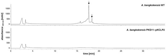 HPLC chromatogram of A. bangkokensis WT (above) and recombinant strain with interrupted PKS cluster #11 (bellow). Arrows indicate peaks of thailandin A (retention time 17.7 min) and thailandin B (retention time 18.3 min). The recombinant strain A. bangkokensis PKS11::pKCLP2 does not produce thailandins anymore.