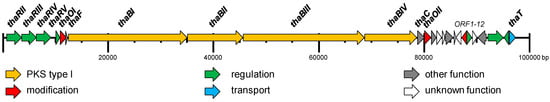 The thailandin biosynthetic gene cluster was further analyzed in detail (Figure 3, Table 2). It spans 96.1 kb with 25 open reading frames (ORFs), but the main cluster probably contains only 13 genes (thaRI-thaOII, thaT). The polyketide synthase is encoded by the four genes thaBI, thaBII, thaBIII and thaBIV. Beside them, the cluster encodes a crotonyl-CoA carboxylase/reductase (thaC), two monooxygenases (thaOI, thaOII), seven regulatory genes (thaRI-thaRIV; orf8/11/12), one MFS transporter (thaT), and further genes with various functions. By BLAST analysis the function of five ORFs could not be assumed.
