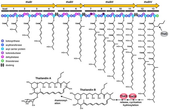Further analysis of the thailandin biosynthetic gene cluster led to the putative biosynthetic pathway of the compounds (Figure 4). The polyketide synthase is composed of one loading module and thirteen extender modules encoded by thaBI-thaBIV. They encode for domains of acyl carrier proteins (ACP), acyltransferases (AT), ketosynthases (KS), dehydratases (DH), ketoreductases (KR), docking (Dock) and a thioesterase (TE). The assembly line order is ThaBI [(KS-AT-ACP)-(KS-AT-KR-ACP)-(KS-AT-DH-KR-ACP)-(KS-AT-DH-KR-ACP)-(KS-AT-DH-KR-ACP)-Dock], ThaBII [Dock-(KS-AT-DH-KR-ACP)-(KS-AT-DH-KR-ACP)-Dock], ThaBIII [Dock-(KS-AT-DH-KR-ACP)-(KS-AT-KR-ACP)-(KS-AT-KR-ACP)-(KS-AT-KR-ACP)-(KS-AT-KR-ACP)-Dock] and ThaBIV [Dock-(KS-AT-KR-ACP)-(KS-AT-KR-ACP)-TE]. Futhermore, docking domains were identified between the PKS enzymes.