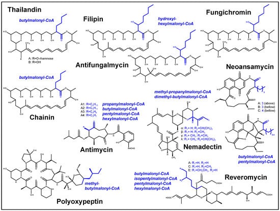 Beside modules 6 and 13, the bioinformatic analysis identified malonyl-CoA as extender unit, which corresponds to the chemical structure of thailandin. In module 6, methylmalonyl-CoA should be incorporated. In the last module we postulated the incorporation of butylmalonyl-CoA. The high diversity among polyketides is caused by the number of modules in the PKS assembly line, the presence of reducing domains, and other modifying enzymes, whereas malonyl-CoA, methylmalonyl-CoA or ethylmalonyl-CoA are usually incorporated. Therefore, butylmalonyl-CoA is an unusual extender unit. From structural analysis, we would also suppose the incorporation of butylmalonyl-CoA in chainin biosynthesis, but so far there is no cluster information available. The usage of unusual extender units is also postulated in few other biosynthetic pathways, but often the acyltransferases seem to be less specific, incorporating not only one defined unit. The AT domain of RevA of the reveromycin biosynthesis putatively uses butylmalonyl-CoA, isopentylmalonyl-CoA, pentylmalonyl-CoA or hexylmalonyl-CoA []. In the biosynthesis of neoansamycin A-C, pentylmalonyl-CoA or butylmalonyl-CoA is incorporated []. Different acylmalonyl-CoA extender units are proposed on the basis of various derivatives in both antimycin [] and nemadectin []. In polyoxypeptin, methylbutylmalonyl-CoA is putatively used as an extender unit []. In the polyene compounds fungichromin, filipin and antifungalmycin, an unusual extender like hydroxyl- hexylmalonyl-CoA should be incorporated. These secondary products with their unusual extender units are shown in Figure 5. The incorporation of the lengthened extender unit in thailandin, chainin, filipin, fungichromin and antifungalmycin leads to the particular C2 side chain of the molecules, which is not common in other polyene compounds. Further structural studies would shed new light on polyene–fungus interaction.