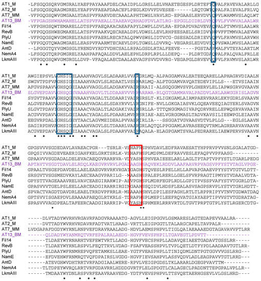 Alignment of acyltransferases with different AT-specificities. AT1-M, AT of thailandin biosynthesis of module 1 with malonyl-CoA specificity; AT2-M, AT of thailandin biosynthesis of module 2 with malonyl-CoA specificity; AT6-MM, AT of thailandin biosynthesis of module 6 with methylmalonyl-CoA specificity; AT13-M, AT of thailandin biosynthesis of module 13 with proposed butylmalonyl-CoA specificity (violet); Fil14, AT of filipin biosynthesis with proposed specificity to hexylmalonyl-CoA; AntD, AT of antimycin biosynthesis with specificity to propanylmalonyl-CoA, butylmalonyl-CoA, pentylmalonyl-CoA and hexylmalonyl-CoA; NemA4, AT of nemadectin biosynthesis with specificity to methyl-propanylmalonyl-CoA and dimethyl-butylmalonyl-CoA; RevB, AT of reveromycin biosynthesis with specificity to butylmalonyl-CoA, isopentylmalonyl-CoA, pentylmalonyl-CoA and hexylmalonyl-CoA; NamE, AT of neoansamycin biosynthesis with specificity to butylmalonyl-CoA and pentylmalonyl-CoA; PlyU, AT of polyoxypeptin biosynthesis with specificity to methyl-butylmalonyl-CoA; motifs highlighted by boxes in blue and red; * indicates highly conserved aa.