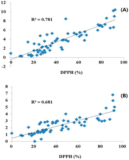 Leaves had a generally higher content of the four flavonoids (0.18–1.47 g/100 g) than flowers (0.16–0.89 g/100 g), whereas, stems had the lower contents of the four flavonoids (0.32–0.65 g/100 g) and LE and AP were not detected. On the other hand, the COP samples showed considerable differences in antioxidant activity over a 32.97%–54.20% range. We suggest that antioxidant activity was changed by the TPC and TFC. Among them, Entry 6 flowers showed strong antioxidant activity of 92.47% (TFC: 10.45 g/100 g; TPC: 5.00 g/100 g), but leaves and stems of Entry 6 showed lower activities with 36.65 (TFC: 5.26 g/100 g; TPC: 2.64 g/100 g) and 45.65% (TFC: 1.75 g/100 g; TPC: 1.91 g/100 g). In addition, Entry 17 leaves and stems had strong inhibition of 90.94% (TFC: 10.22 g/100 g; TPC: 6.78 g/100 g) and 88.20% (TFC: 6.45 g/100 g; TPC: 3.21 g/100 g), more than flowers 27.47% (TFC: 2.22 g/100 g; TPC: 1.46 g/100 g). Similarly, Entry 3, 10, 16 and 20 showed relatively high antioxidant activity; all of these samples also contained above average levels of TFC and TPC. The TFC-rich samples generally showed very strong activities with high TPC. Antioxidant activity was significantly correlated with TPC and TFC.