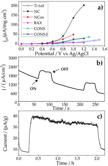 The potential onset of the photocurrent was quite similar for all the carbon anodes varying between +0.6 and +0.8 V vs. Ag/AgCl (Figure 1a); these values were clearly lower than that of the bare current collector. Current densities between 100–200 μA/mg·cm2 were obtained for the highest potentials and the best performing photoanode. Interestingly, a higher photocurrent density was obtained for the nanoporous carbon with a low surface functionalization (sample NC). This contrasts with our previous study [26] where the photochemical response of carbon photoanodes, showing a complex surface chemistry, was linked to the presence of N-, O-, and S-containing functionalities, and suggests that the photoactivity of the nanoporous carbon with low functionalization for water splitting is certainly not linked to the presence of chromophoric surface groups.