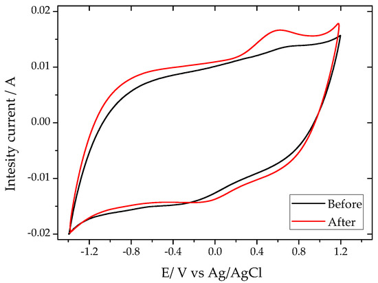 Given that carbon NC was the best performing photoanode (Figure 1a), in further discussion the focus of the analysis will be on this particular carbon material. To evaluate the reproducibility and stability of the electrodes under successive cycles, the photoanodes were exposed to solar irradiation for 2 h at +1 V vs. Ag/AgCl. The long-term performance of sample NC is shown in Figure 1c, and a smooth decay was observed, accounting for ca. 20% photocurrent loss after 2 h. The cyclic voltammograms (CV) of the electrode before and after the illumination are shown in Figure 2. The CV of the as-prepared electrode shows the fingerprint of a highly nanoporous carbon with a quasi-rectangular shape due to the electrical double layer capacitance of the material. Interestingly, after the electrode is exposed to solar light and/or polarization, a wide hump centered at about +0.6 V vs. Ag/AgCl appeared. The intensity of the hump is more clearly seen in the anode exposed to light, suggesting some kind of surface photosensitivity of the carbon material during the photocatalytic water splitting process, likely involving the formation of O surface groups in different environments [30], or that some specific sites of the carbon electrode might consume the photogenerated charges. Furthermore, data suggest that the occurrence of irreversible changes in the surface of the carbon during the photocatalytic process might be responsible for the drop in the long-term performance of the photoanode after 2 h of irradiation. Photocorrosion of the anodes after illumination was also observed in the functionalized carbons, and attributed to redox reactions involving the surface moieties of the carbon matrix, ultimately giving rise to the consumption of the photoactive sites and charge transfer limitations [26].