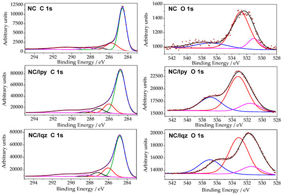 C 1s and O 1s core energy levels for the pristine nanoporous carbon (sample NC) and after irradiation using 200 < λ < 600 nm (sample NC/Iqz) and 360 < λ < 600 nm (sample NC/Ipy). Symbols correspond to experimental data, and lines to deconvolution.