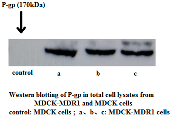Total cellular protein was extracted from MDCK and MDCK-MDR1 cells, and P-gp expression was detected using western blotting. An obvious protein band of 170 kDa was observed in MDCK-MDR1 cell extracts, but no band was present at the corresponding position in MDCK extracts (Figure 1).