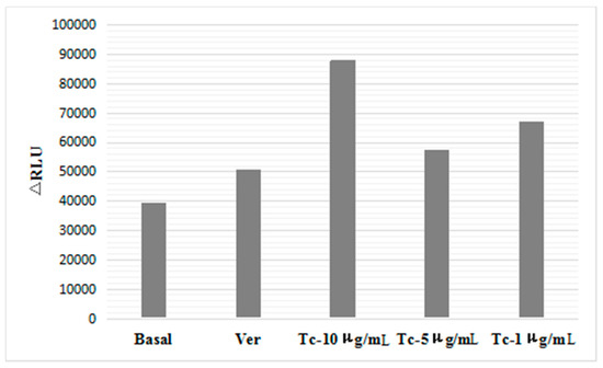 Figure 3 shows the results. The ΔRLUTC values of different imperatorin concentrations were higher than ΔRLUbasal, indicating that imperatorin activated P-gp ATPase activity. This activation likely plays a role in the inhibition of P-gp-mediated drug efflux. Ver is a substrate of P-gp that also activates its ATPase activity. We concluded that imperatorin enhanced ATPase activity in a similar manner as Ver.