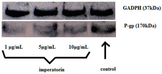 P-gp expression levels were investigated by western blotting and bands were photographed. Figure 5 show that imperatorin decreased P-gp expression compared to the control group.
