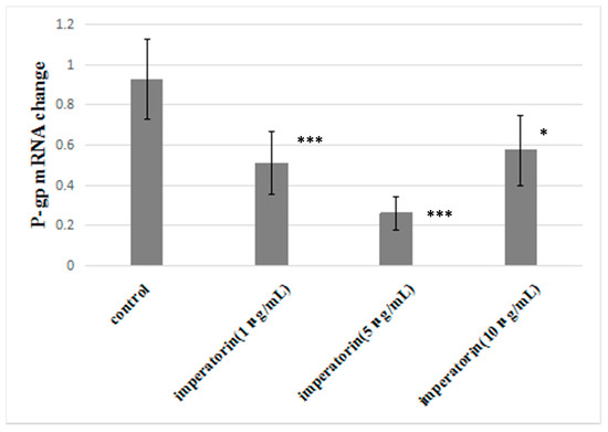 Effect of imperatorin on P-gp mRNA expression in MDCK-MDR1. Statistical significance is denoted * p < 0.05, *** p < 0.001 compared with control group.