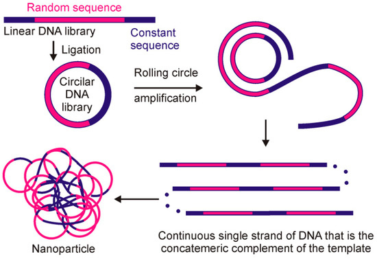 Selectable libraries of DNA nanoparticles can be generated by rolling circle amplification (RCA) of cyclized template containing random region. To this purpose, Steiner et al. [71] developed a new method called DeNAno to obtain DNA superstructures specific to human dendritic cells. Rolling circle replication of a circular DNA template using a strand displacing DNA polymerase produces a continuous single strand of DNA that is the concatemeric complement of the template. This ssDNA condenses into a discrete particle that can be visualized by fluorescent microscopy and flow cytometry if fluorescently labeled (see Figure 2 for the general scheme of the method). These cell targeting DNA nanoparticles, which in fact are multivalent aptamers, may found applications in cell imaging, cell sorting, and cancer therapy.