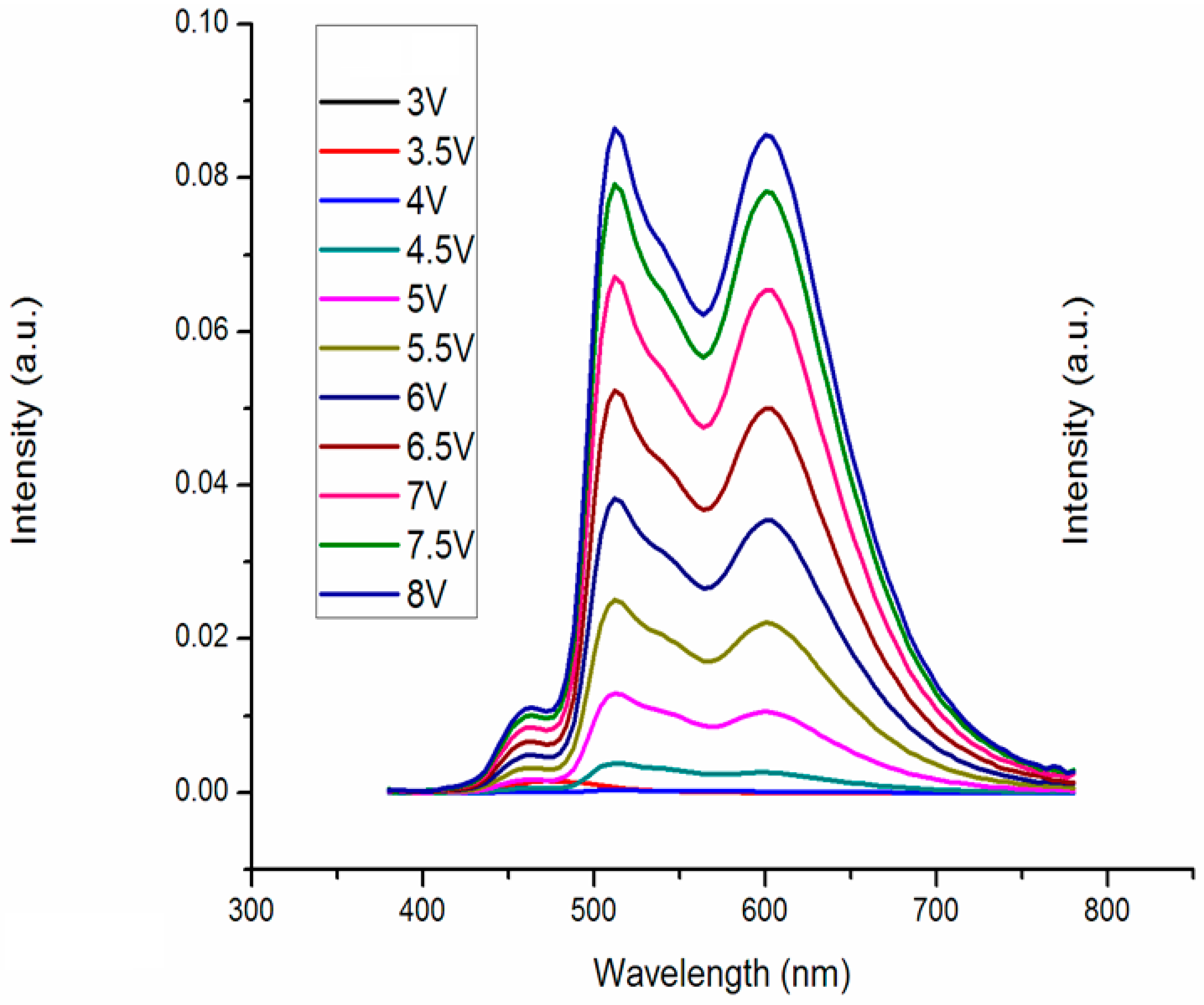 It can be seen from the spectrum diagram in Figure 2 that the red–green–blue (RGB) peak wavelength appeared at 460 nm, 512 nm, 596 nm, which belongs to BCzVBi, Ir(ppy)3, and Ir(MDQ)2(acac).