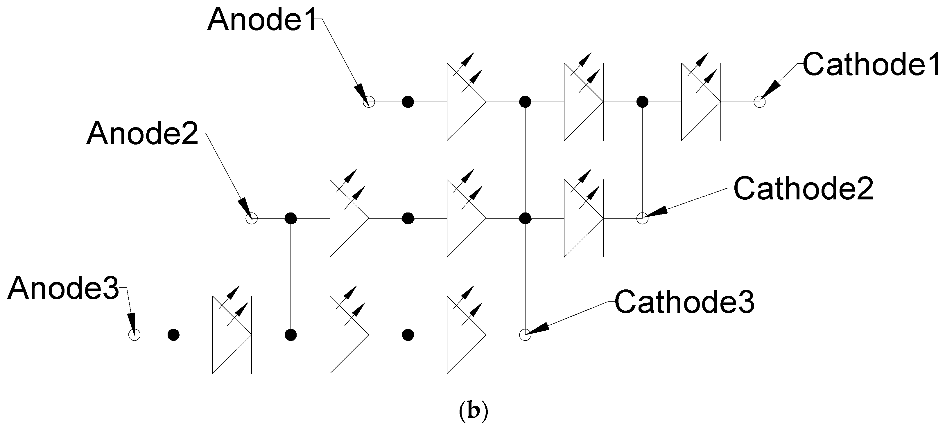 The test sample of our novel design. (a) Three pairs of anode/cathode/electrode are all connected; (b) anode3 is open; (c) anode2 and anode3 are open.