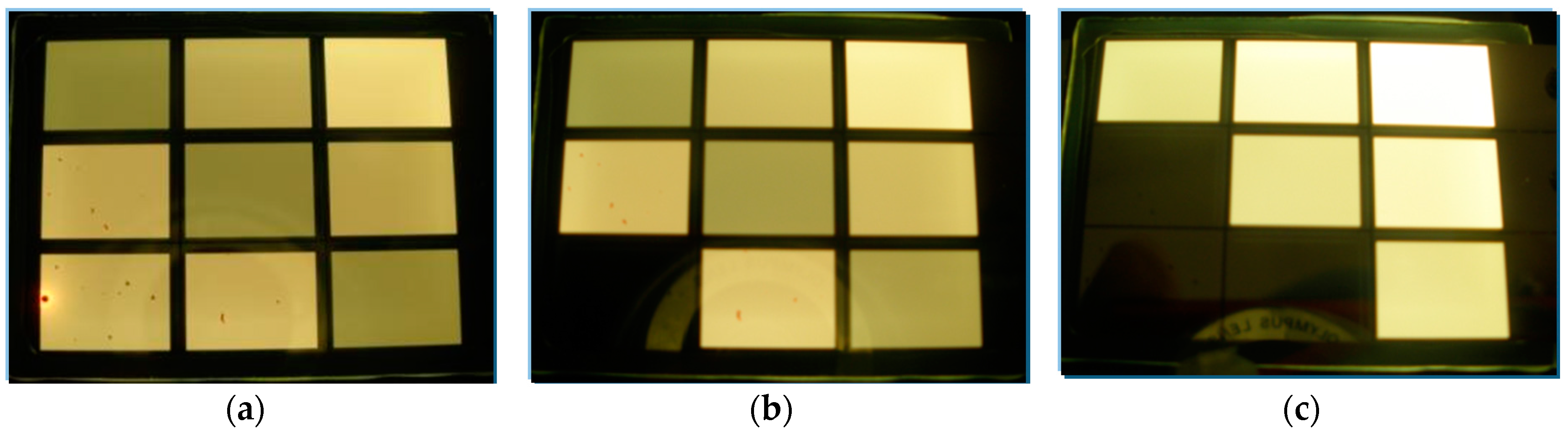 Figure 4 is our novel WOLED design. There is no metal mesh in the emitting area, so it does not need a metal photolithography cycle in the WOLED manufacture process. The main idea of this design is that we used a hyper driving method for the WOLED panel and then divided the WOLED panel into different sub-emitting areas according to the hyper driving topology. Figure 4a depicts the novel layout design, where there are three pairs of anode/cathode/electrode, and we were able to add more pairs of anode/cathode/electrode. With that, we could divide the entire emitting area of the WOLED panel into nine sub-emitting area aligned lines and rows adjacent to each other, 3 units × 3 units. For every sub-emitting area in the line direction, its anode contacted with the cathode of the prior sub-emitting area; for every sub-emitting area in the row direction, its cathode contacted with the anode of the following sub-emitting area. Every sub-emitting area had a turn-on voltage of 5 V. Figure 4b shows the driving topology for the 3 units × 3 units. hyper driving method. In our test sample, the anode1/anode2/anode3 had voltages of 15 V/20 V/25 V, and the cathode1/cathode2/cathode3 had voltages of 0 V/5 V/10 V.