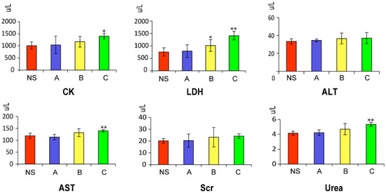The detection and analysis of the enzymatic spectrum of serum are important to evaluate the extent of organ damage caused by toxic effects. In this study, we selected CK and LDH (heart damage detection index), ALT and AST (liver damage monitoring indicators), and Urea and Scr (kidney damage detection index) to evaluate the toxicity of Radix Aconiti. Creatine kinase (CK) and lactate dehydrogenase (LDH) are the commonly used indicators to assess the heart toxicity [14,15,16]. Their levels in the serum from the model group were compared with NS group by t-test. Kidney damage is indicated by increased contents of conventional indicators serum creatinine (Scr) and serum urea in the model groups compared with those in the control group [17,18]. Aspartate aminotransferase (AST), and alanine aminotransferase (ALT) values in the administration and normal control were compared to evaluate liver toxicity [19,20,21]. The biochemical results of our experiments are described in Figure 1. These biochemical parameters increased in a dose-dependent manner. Compared with control group, CK, AST, Urea and LDH significantly increased in the high dose (10 g/kg) group of Radix Aconiti extract; LDH also significantly increased in the middle dose group.