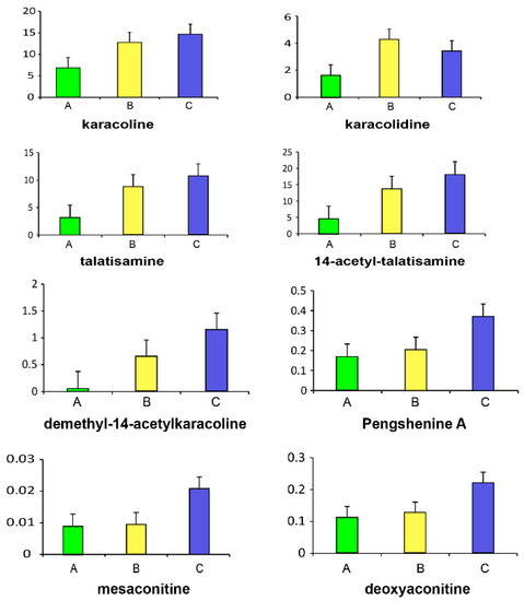 The variation trends of biomarkers’ relative contents (peak area intensities) in Radix Aconiti ethanol extraction groups with different doses. Significant difference from control: * p < 0.05, ** p < 0.01. NS: Normal Saline; A: 2 g/kg ethanol extraction; B: 5 g/kg ethanol extraction; C: 10 g/kg ethanol extraction.