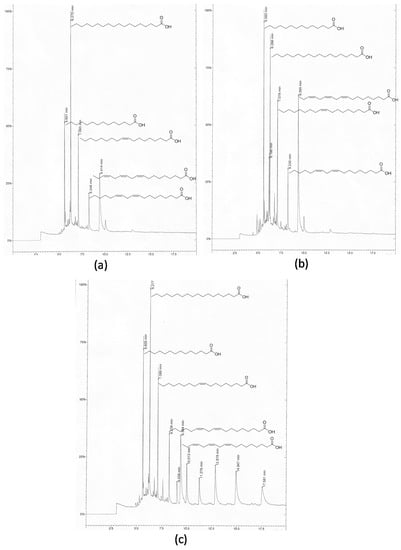 Chromatograms of the lipid profile of the hexane extractions performed in juices: (a) control juice; (b) pasteurized juice; and (c) thermoultrasonicated juice.