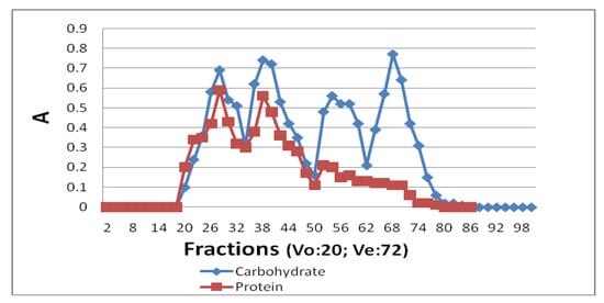 The mycelium extract of T. fuciformis was dissolved in water, and the solution was centrifuged to remove the solid residue. The aqueous solution was concentrated before being precipitated with 70% ethanol, which was removed by centrifuge (4500 rpm, 15 min). The precipitated material was lyophilized to afford the crude polysaccharides (P). Afterwards the polysaccharides (15 g) were applied to a Sephadex G-100 column (Pharmacia, Stockholm, Sweden; 80 cm × 10 cm) and washed with water. The eluted fractions (15 mL) were collected and carbohydrates, uronic acids, and proteins were detected in each fraction. According to the elution pattern (Figure 1), the fractions 18–34, 35–50, 51–62, and 63–80 were collected and lyophilized to get the combined A, B, C, and D fractions. Properties of the fractions are listed in Table 1.