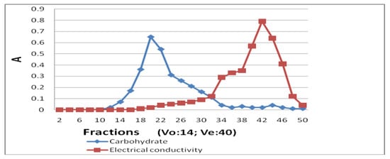 CITG (200 mg) was dissolved in 10 mL pure water and the sample solution was applied to a Sephadex G-50 column (40 cm × 5 cm), and eluted with water. According to the elution pattern (Figure 2) as described by the carbohydrate content and electrical conductivity in each collected fraction (12 mL/tube) and the volume of water inside and outside of the column, fractions 18–32 were collected, concentrated, and freeze dried to remove the remaining reagents and obtain the purified iodine-substituted tremella glycoprotein (ITG).