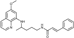(E)-N-(4-(6-Methoxyquinolin-8-ylamino)pentyl)-3-phenylacrylamide (3a): Compound 3a was synthesized according to the general procedure (method A) using chloride 4a (0.108 g, 0.65 mmol) and PQ diphosphate (0.228 g, 0.5 mmol). After purification by column chromatography (CH2Cl2/MeOH = 95:5) and recrystallization from EtOAc/ether, pure compound 3a was obtained (0.126 g, 65%, m.p. = 72–74 °C). IR (KBr) (cm−1): 3387, 3282, 3061, 2927, 2852, 1660, 1614, 1576, 1556, 1516, 1454, 1424, 1387, 1338, 1220, 1203, 1160, 1052, 1031, 977, 902, 863, 822, 791, 766, 680, 626. 1H-NMR (δ/ppm): 8.55–8.53 (dd, 1H, J = 1.43, 4.13), 8.13 (t, 1H, J = 5.69), 8.09–8.06 (dd, 1H, J = 1.43, 8.28), 7.55 (d, 2H, J = 6.49), 7.45–7.34 (m, 5H), 6.61 (d, 1H, J = 15.82), 6.47 (s, 1H), 6.28 (s, 1H), 6.15 (d, 1H, J = 8.73), 3.81 (s, 3H), 3.66 (m, 1H), 3.21 (m, 2H), 1.64 (m, 4H), 1.22 (d, 3H, J = 6.25). 13C-NMR (δ/ppm): 164.78, 159.01, 144.64, 144.23, 138.40, 134.96, 134.80, 134.52, 129.58, 129.33, 128.89, 127.44, 122.32, 122.10, 96.12, 91.61, 54.96, 47.01, 39.02, 33.54, 26.03, 20.23. MS (ESI): m/z = 390.3 [M + H]+. Anal. Calcd. For C24H27N3O2: C, 74.31; H, 6.99; N, 10.79. Found: C, 74.49; H, 7.02; N, 10.50.