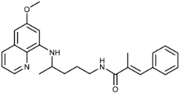 (E)-N-(4-(6-Methoxyquinolin-8-ylamino)pentyl)-2-methyl-3-phenylacrylamide (3b): Compound 3b was synthesized according to the general procedure (method A) using chloride 4b (0.117g, 0.65 mmol) and PQ diphosphate (0.228 g, 0.5 mmol). After purification by column chromatography (CH2Cl2/MeOH = 95:5), oil compound 3b was obtained (0.157 g, 78%). IR (film) (cm−1): 3378, 3054, 2936, 2867, 1735, 1651, 1616, 1578, 1519, 1456, 1424, 1388, 1271, 1220, 1202, 1158, 1052, 1031, 926, 900, 822, 792, 763, 738, 703, 624. 1H-NMR (δ/ppm): 8.55–8.53 (dd, 1H, J = 1.63, 4.19), 8.09–8.03 (m, 2H), 7.45–7.28 (m, 6H), 7.18 (s, 1H), 6.48 (s, 1H), 6.28 (s, 1H), 6.16–6.14 (d, 1H, J = 8.75), 3.81 (s, 3H), 3.70–3.63 (m, 1H), 3.23–3.17 (m, 2H), 1.99 (s, 3H), 1.73–1.56 (m, 4H), 1.24–1.23 (d, 3H, J = 6.29). 13C-NMR (δ/ppm): 168.71, 159.02, 144.58, 144.27, 136.14, 134.80, 134.54, 132.68, 131.87, 129.58, 129.17, 128.35, 127.56, 122.10, 96.11, 91.58, 54.96, 47.04, 39.02, 33.43, 25.95, 20.19, 14.29. MS (ESI): m/z = 404.3 [M + H]+. Anal. Calcd. For C25H29N3O2: C, 74.41; H, 7.24; N, 10.41. Found: C, 74.20; H, 7.02; N, 10.66.