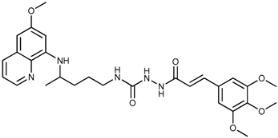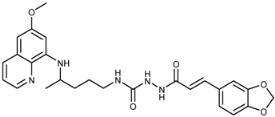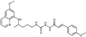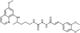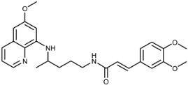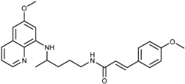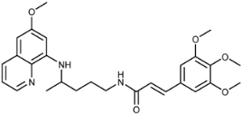 (E)-N-(4-(6-Methoxyquinolin-8-ylamino)pentyl)-3-(3,4,5-trimethoxyphenyl)acrylamide (3e): Compound 3e was synthesized according to the general procedure using chloride 4e (0.169 g, 0.65 mmol) and PQ diphosphate (0.228 g, 0.5 mmol) (method A) or compound 2e (0.109 g, 0.32 mmol) and PQ diphosphate (0.146 g, 0.32 mmol) (method B). After purification by column chromatography (petroleum ether/EtOAc/MeOH 30:10:5) and crystallization from EtOAc, pure compound 3e was obtained (0.125 g, 52%, method A; 0.106 g, 69%, method B, m.p. = 120–123.5 °C). IR (KBr) (cm−1): 3367, 3285, 3084, 2962, 1657, 1617, 1583, 1520, 1456, 1421, 1388, 1328, 1277, 1241, 1221, 1200, 1164, 1125, 1052, 1014, 978, 824, 792, 682, 622, 604. 1H-NMR (δ/ppm): 8.54–8.53 (d, 1H, J = 2.85), 8.09–8.03 (m, 2H), 7.44–7.40 (m, 1H), 7.37–7.32 (d, 1H, J = 15.68), 6.88 (s, 2H), 6.54–6.52 (d, 1H, J = 15.69), 6.47 (s, 1H), 6.28 (s, 1H), 6.15–6.12 (d, 1H, J = 8.69), 3.81 (s, 9H), 3.68 (s, 4H), 3.21–3.19 (m, 2H), 1.69–1.65 (m, 4H), 1.23–1.22 (d, 3H, J = 6.15). 13C-NMR (δ/ppm): 164.83, 158.97, 153.00, 144.62, 144.18, 138.57, 138.46, 134.74, 134.49, 130.55, 129.53, 122.04, 121.66, 104.87, 96.08, 91.61, 60.02, 55.82, 54.92, 46.99, 39.02, 33.56, 25.98, 20.20. MS (ESI): m/z = 480.3 [M + H]+. Anal. Calcd. For C27H33N3O5: C, 67.62; H, 6.94; N, 8.76. Found: C, 67.99; H, 7.06; N, 8.99.