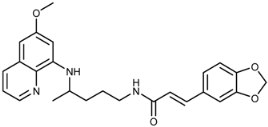 (E)-3-(Benzo[d][1,3]dioxo-5-yl)-N-(4-(6-methoxyquinolin-8-ylamino)pentyl)acrylamide (3f): Compound 3f was synthesized according to the general procedure (method A) using chloride 4f (0.137 g, 0.65 mmol) and PQ diphosphate (0.228 g, 0.5 mmol). After purification by column chromatography (CH2Cl2/MeOH = 97:3) and recrystallization from EtOAc/ether, pure compound 3f was obtained (0.124 g, 57%, m.p. = 77–79.5 °C). IR (KBr) (cm−1): 3350, 3253, 3069, 2961, 2934, 1738, 1655, 1620, 1576, 1557, 1520, 1491, 1454, 1425, 1387, 1356, 1334, 1281, 1247, 1200, 1167, 1124, 1096, 1041, 977, 927, 855, 819, 792, 752, 681, 624, 593. 1H-NMR (δ/ppm): 8.53-8.51 (dd, 1H, J = 1.61, 4.18), 8.07–8.04 (dd, 1H, J = 1.57, 8.29), 7.99–7.95 (t, 1H, J = 5.52), 7.43–7.39 (m, 1H), 7.33–7.28 (d, 1H), 7.11 (s, 1H), 7.05–7.02 (dd, 1H, J = 1.46, 8.11), 6.93–6.91 (d, 1H, J = 8.00), 6.46–6.40 (m, 2H), 6.27 (s, 1H), 6.14–6.11 (d, 1H, J = 8.77), 6.04 (s, 2H), 3.80 (s, 3H), 3.64 (m, 1H), 3.21–3.15 (m, 2H), 1.69–1.51 (m, 4H), 1.22–1.20 (d, 2H, J = 6.29). 13C-NMR (δ/ ppm): 164.93, 158.97, 148.29, 147.85, 144.61, 144.18, 138.13, 134.73, 134.49, 129.53, 129.33, 123.00, 122.05, 120.42, 108.49, 106.11, 101.33, 96.08, 91.61, 54.93, 46.99, 39.02, 33.53, 26.01, 20.19. MS (ESI): m/z = 434.2 [M + H]+. Anal. Calcd. For C25H27N3O4: C, 69.27; H, 6.28; N, 9.69. Found: C, 69.40; H, 6.69; N, 9.22.