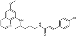 (E)-3-(4-Chlorophenyl)-N-(4-(6-methoxyquinolin-8-ylamino)pentyl)acrylamide (3g): Compound 3g was synthesized according to the general procedure using chloride 4g (0.131 g, 0.65 mmol) and PQ diphosphate (0.228 g, 0.5 mmol) (method A) or 2g (0.113 g, 0.4 mmol) and PQ diphosphate (0.182 g, 0.4 mmol) (method B). After purification by column chromatography (CH2Cl2/MeOH = 97:3), pure compound 3g was obtained (0.167 g, 79%, method A; 0.056 g, 33%, method B, m.p. = 85–87 °C). IR (KBr) (cm−1): 3358, 3275, 3078, 2958, 2327, 2857, 1740, 1655, 1615, 1558, 1520, 1492, 1457, 1426, 1388, 1343, 1227, 1202, 1168, 1097, 1052, 1013, 982, 903, 823, 791, 736, 709, 677, 628. 1H-NMR (δ/ppm): 8.54–8.53 (dd, 1H, J = 1.60, 4.19), 8.13–8.05 (m, 2H), 7.58–7.56 (d, 2H, J = 8.54), 7.47–7.37 (m, 4H), 7.63–7.58 (d, 1H, J = 15.82), 7.47 (s, 1H), 6.28 (s, 1H), 6.15–6.12 (d, 1H, J = 8.79), 3.81 (s, 3H), 3.65 (m, 1H), 3.22–3.20 (m, 2H), 1.72–1.53 (m, 4H), 1.23–1.21 (d, 3H, J = 6.28). 13C-NMR (δ/ ppm): 164.56, 158.97, 144.60, 144.18, 136.97, 134.73, 134.49, 133.91, 133.68, 129.53, 129.08), 128.85, 123.14, 122.03, 96.08, 91.61, 54.92, 46.98, 39.02, 33.51, 26.95, 20.19. MS (ESI): m/z = 424.2 [M + H]+. Anal. Calcd. For C24H26ClN3O2: C, 68.00; H, 6.18; N, 9.91. Found: C, 68.44; H, 6.35; N, 10.05.