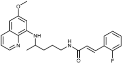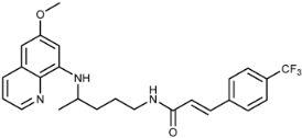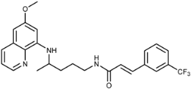 (E)-N-(4-(6-Methoxyquinolin-8-ylamino)pentyl)-3-(3-trifluoromethyl)phenyl)acrylamide (3i): Compound 3i was synthesized according to the general procedure (method A) using chloride 4i (0.152 g, 0.65 mmol) and PQ diphosphate (0.228 g, 0.5 mmol). After purification by column chromatography (CH2Cl2/MeOH = 97:3) and recrystallization from EtOAc/petroleum ether, pure compound 3i was obtained (0.162 g, 71%, m.p. = 48.5–49.5 °C). IR (KBr) (cm−1): 3262, 3075, 2964, 2861, 1661, 1618, 1561, 1520, 1454, 1387, 1335, 1221, 1166, 1126, 975, 803, 864, 820, 793, 735, 688, 625, 584, 513. 1H-NMR (δ/ppm): 8.55–8.53 (dd, 1H, J = 1.46, 4.10), 8.15–8.11 (t, 1H, J = 5.51), 8.08–8.05 (dd, 1H, J = 1.56, 8.27), 7.89–7.84 (m, 2H), 7.73–7.62 (m, 2H), 7.52–7.47 (d, 1H, J = 15.84), 7.44–7.40 (m, 1H), 6.77–6.72 (d, 1H, J = 15.85), 6.47 (s, 1H), 6.29 (s, 1H), 6.16–6.13 (d, 1H, J = 8.76), 3.81 (s, 3H), 3.66 (m, 1H), 3.23–3.21 (m, 2H), 1.72–1.57 (m, 4H), 1.24–1.22 (d, 3H, J = 6.25). 13C-NMR (δ/ppm): 164.34, 158.97, 144.61, 144.18, 136.62, 136.17, 134.73, 134.50, 132.28–122.55 (q, J = 244.60), 131.20, 130.28–128.83 (q, J = 31.73), 129.96, 129.44, 125.60–125.46 (q, J = 3.70), 124.48, 123.75–123.60 (q, J = 3.71), 122.03, 96.09, 91.60, 54.91, 46.98, 39.02, 33.50, 25.91, 20.20. MS (ESI): m/z = 458.3 [M + H]+. Anal. Calcd. For C25H26F3N3O2: C, 65.63; H, 5.73; N, 9.18. Found: C, 65.24; H, 6.00; N, 9.43.