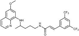 (E)-3-(3,5-Bis(trifluoromethyl)phenyl)-N-[4-(6-methoxyquinolin-8-ylamino)pentyl]acrylamide (3k): Compound 3k was synthesized according to the general procedure (method A) using chloride 4k (0.097 g, 0.32 mmol) and PQ diphosphate (0.114 g, 0.25 mmol). After purification by column chromatography (CH2Cl2/MeOH = 95:5) and crystallization from ether, pure compound 3k was obtained (0.097 g, 74%, m.p. = 148–150 °C). IR (KBr) (cm−1): 3395, 3286, 3095, 2964, 2934, 2861, 1663, 1623, 1576, 1521, 1456, 1423, 1334, 1341, 1278, 1224, 1174, 1136, 1052, 1031, 978, 940, 899, 868, 845, 822, 792, 683, 624. 1H-NMR (δ/ppm): 8.54 (s, 1H), 8.26 (s, 2H), 8.18 (t, 1H, J = 5.21), 8.08–8.07 (m, 2H), 7.60–7.58 (d, 1H, J = 15.82), 7.44–7.42 (m, 1H), 6.91–6.88 (d, 1H, J = 15.90), 6.47 (s, 1H), 6.28 (s, 1H), 6.16–6.14 (d, 1H, J = 8.54), 3.80 (s, 3H), 3.66 (m, 1H), 3.23 (m, 2H), 1.70–1.58 (m, 4H), 1.23–1.22 (d, 3H, J = 5.99). 13C-NMR (δ/ppm): 164.07, 159.00, 144.64, 144.24, 137.97, 135.16, 134.81, 134.53, 131.14–130.48 (q, J = 33.83), 129.58, 127.84, 126.61, 125.94–120.54 (q, J = 272.30), 122.23, 122.11, 96.14, 91.59, 54.95, 46.99, 39.02, 33.51, 25.92, 20.25. MS (ESI): m/z = 526.4 [M + H]+. Anal. Calcd. For C26H25F6N3O2: C, 59.43; H, 4.80; N, 8.00. Found: C, 59.67; H, 5.02; N, 8.22.
