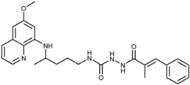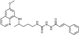 (E)-1-Cinnamoyl-4-(4-(6-methoxyquinolin-8-ylamino)pentyl)semicarbazide (7a): Compound 7a was synthesized according to the general procedure using chloride 4a (0.183 g, 1.1 mmol) and compound 6 (0.317 g, 1 mmol). After purification by column chromatography (CH2Cl2/MeOH = 95:5) and crystallization from ether/petroleum ether, pure compound 7a was obtained (0.251 g, 56%, m.p. = 188–190 °C, decomp.). IR (KBr) (cm−1): 3302, 3236, 3038, 2936, 1696, 1628, 1578, 1596, 1458, 1388, 1424, 1356, 1222, 1156, 1054, 978, 862, 822, 790, 762, 726, 678, 658, 632, 556, 488. 1H-NMR (δ/ppm): 9.75 (s, 1H), 8.54–8.53 (dd, 1H, J = 1.41), 8.09–8.06 (dd, 1H, J = 1.30, 8.25), 7.85 (s, 1H), 7.58–7.36 (m, 7H), 6.65–6.60 (d, 1H, J = 15.90), 6.48–6.44 (m, 2H), 6.28 (s, 1H), 6.13–6.10 (d, 1H, J = 8.62), 3.82 (s, 3H), 3.64 (m, 1H), 3.06–3.04 (m, 2H), 1.63–1.47 (m, 4H), 1.22–1.20 (d, 3H, J = 6.24). 13C-NMR (δ/ppm): 164.65, 158.98, 157.92, 144.61, 144.20, 139.46, 134.74, 134.67, 134.49, 129.60, 129.53, 128.92, 127.50, 122.04, 119.94, 96.07, 91.61, 54.95, 47.01, 39.02, 33.41, 26.65, 20.18. MS (ESI): m/z = 448.3 [M + H]+. Anal. Calcd. For C25H29N5O3: C, 67.09; H, 6.53; N, 15.65. Found: C, 67.37; H, 6.22; N, 15.66.